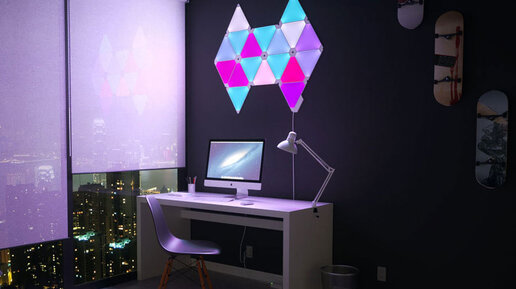 Что такое Nanoleaf Aurora? Система освещения Nanoleaf Aurora состоит из треугольных панелей, которые можно соединять друг с другом в произвольном порядке. Стартовый набор включает в себя 9 таких панелей. Таким образом источник света превращается в необычные геометрические фигуры, которые несомненно зададут тон всему помещению или станут заключительным дизайнерским штрихом. Каждая панель способна отображать более 16 миллионов цветов и оттенков: можно создать целое расписание, чтобы Nanoleaf Aurora...