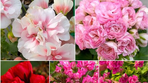 ЕС магия Кунцита (махровая, розебудная пеларгония), Анна Жанет, Кармен Андрея-Тюльпановидная пеларгония), Ю царь девица) обильно цветущая
