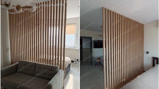 Приветствуем Вас читатель. Сегодняшняя статья - фото разбор в каком случае у кровати нужна реечная перегородка и как спланировать ее установку: какой ширины должна быть эта перегородка, какое расстояние сделать между брусьями и как их расположить. Начнем с самой распространенной задачи: Перегородка из реек между кроватью и диваном, то есть делим комнату на зону отдыха и гостевую зону. Здесь у нас будет 3 основных варианта. Вариант 1. Мы ставим перегородку по ширине = глубине дивана + 200 мм. Зачем эти +200 мм ? Это ноги, свисающие с дивана...