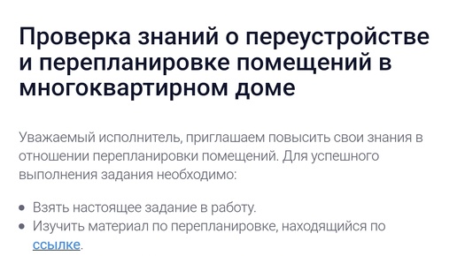 В проекте "Город заданий" есть возможность получить это задание. Оно несложное - нужно правильно ответить всего на 8 из 10 вопросов, и в случае верных ответов начислят 470 баллов. Само задание довольно трудно поймать, так как оно быстро распространяется, и иногда вопросы к нему изменяются. Разработать техническое заключение о допустимости и безопасности выполненных работ-подать заявление-предъявить работы Мосжилинспекции Нужно внести изменений в технический паспорт Услуга предоставляется бесплатно...