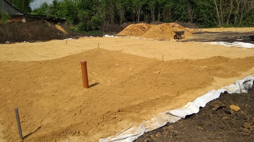 После того, как нам завезли песок и трактор всё раскидал и немного разровнял, приступили мы к своим планам. Наша задача в первую очередь состояла в том, чтобы вручную выровнять в "ноль" песчаную подушку...