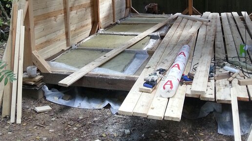 💿 Пришло время делать пол, напомню, предполагалось, что весь сарай по контуру, стены, пол, потолок, будет утеплен пятью сантиметрами минеральной ваты. Пол 👉 Ранее мы уже сделали черновой фальш пол, просто положив доски на привинченные к основанию бруски, под всем сараем постелили рубероид, для минимизации действия водяных паров на доски чернового пола. Все доски я обрабатывал антисептиком, хочется все элементы сарая максимально обезопасить от возможного гниения. С этими патологическим промазыванием всего, я прилично попал, но об этом я расскажу чуть позже...