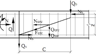 Расчёт железобетонных элементов по прочности при действии поперечных сил (Расчёт на срез) производят на основе модели наклонных сечений (по СП 63.13330). Усилия от внешней нагрузки не должны превышать соответствующих усилий в элементах конструкции (несущей способности). В общем случае, усилия, действующие в наклонном сечении включают: (это усилия в связях, соединяющих блок, выделенный в элементе наклонным сечением и нормальным сечением, проходящем по нижнему, растянутому концу наклонного...