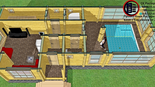 Баня с бассейном, парной, душевой, большой гостевой, раздевалкой и туалетом. Проект и видео