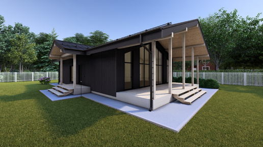 Проект каркасного одноэтажного дома 130 кв.м. с террсой и крыльцом.