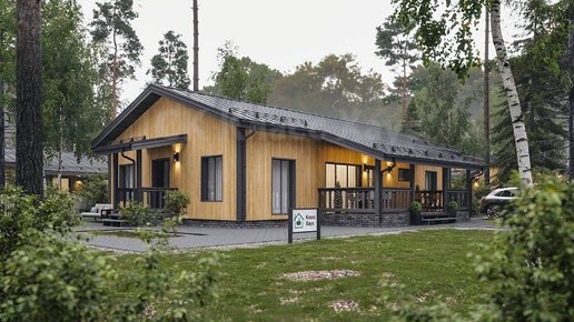 Одноэтажный каркасный дом 131кв. м, габариты 9×14,6 м. Четыре спальни, санузел, входная зона, просторная кухня-гостиная и две террасы. Дом оборудован отдельными техническими помещениями - котельной, кладовой и постирочной.