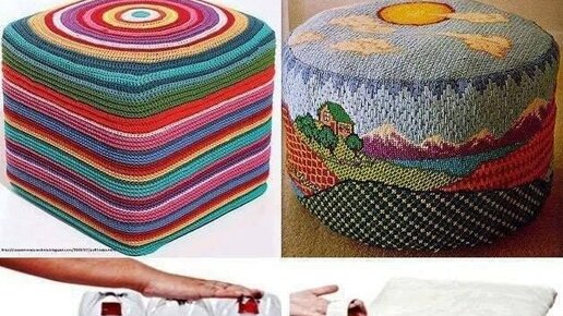 Очень интересной идеей может стать пуфик из пластиковых бутылок. Такой пуф, добавит оригинальности прихожей или даче. Как и все, что делается своими руками, затрат почти не требуется, а результат поразит вас своим итогом. Для основы пуфика, нам потребуются пластиковые бутылки и скотч. Для того чтобы пуф был крепким и на нем можно было спокойно сидеть взрослому человеку, бутылки лучше брать не ровные, а фигурные. Хорошо их укрепить. Для этого бутылки нужно на несколько минут положить в морозилку. Затем вытащить и быстро закрыть крышками...