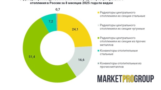 За 8 месяцев 2025 года производство радиаторов составило 22 ГВт, на 54,0% больше показателя аналогичного периода предыдущего года. Согласно данным исследования «Анализ рынка металлических радиаторов центрального отопления в России в 2025 году» компании MarketProGroup, стальных радиаторов центрального отопления за период с января по август 2025 года в России было выпущено 5,32 ГВт, что всего на 1,1% выше уровня выпуска аналогичного периода предыдущего года. Однако из-за значительного роста выпуска...
