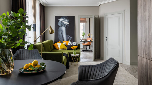 Владелица квартиры хотела изолированную спальню, кабинет, объединенную кухню-гостиную, отдельную гардеробную и два санузла — личный и гостевой. Все это удалось реализовать в ходе перепланировки. Гостиная В отделке гостиной задействовали влагоустойчивые английские краски. Диван выставили напротив одного из окон. Его ярко-зеленая обивка перекликается с оттенком акцентной стены за телевизором. Кухня Г-образный кухонный гарнитур встроили в нишу. Нишеобразующую перегородку оформили в тон фасадов шкафов-колонн...