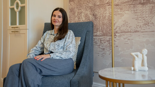 Дизайнер Ольга Бухарева оформила евродвушку площадью 59 м² для женщины, которая работает художником-модельером. Интерьер выполнили в стиле американской классики. Чтобы оптимизировать пространство, потребовалась серьезная перепланировка. Планировка Кухню-гостиную и спальню поменяли местами. Это оказалось возможным, поскольку на этаже ниже располагается коммерческое помещение. Прилегающий теперь уже к приватной комнате второй санузел переделали в гардеробную, которая также выполняет функции постирочной...