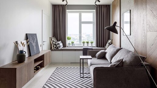 Дизайнер Рустэм Уразметов заложил продуманную планировку в основу интерьера. На небольшой площади удалось разместить всё необходимое для жизни. Заказчик — молодая девушка, которая хотела совместить современный стиль с элементами лофта. Так в интерьере появились слэбы из дерева, бетонные поверхности и металлические элементы. Изначально квартира представляла собой стандартный прямоугольник с двумя окнами с одной стороны и коммуникациями с другой. На небольшой площади в 47 м² необходимо было разместить объединенную кухню-гостиную, спальню с рабочим местом, санузел, гардеробную и кладовую...