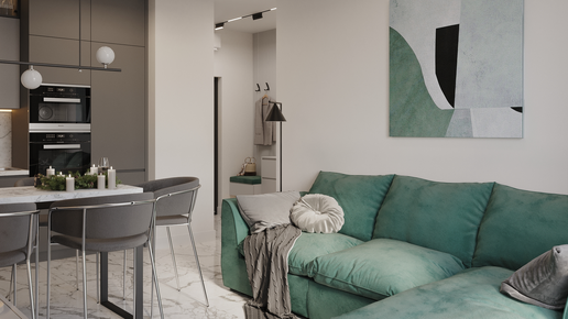 Главной задачей в этом проекте было сделать пространство максимально воздушным и просторным. Мы решили убрать все лишние перегородки, объединив прихожую с кухней-гостиной. А чтобы уж совсем "растворить" стены, добавили зеркало до потолка и поиграли с цветом: белый фон, графитовый гардероб и нежный серый на 3D-панелях и тумбе. Адрес: ЖК Грин Парк Кол-во комнат: 1 Площадь: 41 м² Стиль: современный В прихожей мы создали такую динамичную композицию за счет игры света и цвета. Вот, например, этот изумрудный...