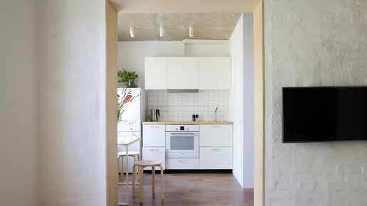 Архитекторы KDVA Architects сохранили бетонные потолки и кирпичную кладку на стенах, покрасили их в белый цвет и соорудили мебель из берёзовой фанеры. А единственной перепланировкой в панельной однушке стал новый дверной проём между кухней и гостиной. Ещё один дверной проём между кухней и гостиной превратил типовую однушку в удобную студию. Теперь пятиметровая кухня не кажется такой тесной, а в гостиной появилась возможность выделить зону спальни. Блок для сна соорудили из берёзовой фанеры. В него встроили систему хранения...