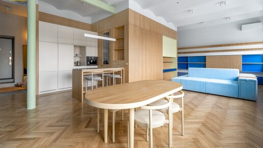 Уютная и светлая квартира в скандинавском стиле. У нас получилась просторная квартира с продуманной эргономикой и необычными цветовыми решениями: кухня-гостиная выполнена в голубом и фисташковом цветах — они очень эффектно сочетаются с деревом в отделке. За счет белого цвета все комнаты органично сливаются воедино ПРОЕКТ 3-комнатная, 80м²