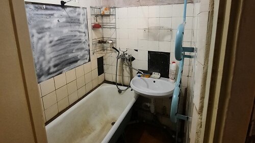 Так выглядели ванна с туалетом до ремонта. На сколько все запущено Вы можете увидеть на фото. Ванна и туалет разделяются на два помещения. На полу и стенах старая с советских времен плитка. Чугунная ванна требует реставрации или замены. Двери просто в печальном состоянии и плохо закрываются. Унитаз выдвинут слишком далеко от стены и сидя на нем, ноги упираются в дверь. Вначале вынесли ванну и очистили пол и стены от плитки. Так же демонтировали дверные коробки. Затем снесли стену между туалетом и ванной и демонтировали световое окно...