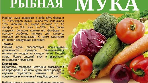 Рыбная мука – чистая органика , которая отлично подойдёт для подкормок любых садово -огородных культур . Устраняет дефицит азота , кальция и фосфора в растениях и активирует обменные процессы ...