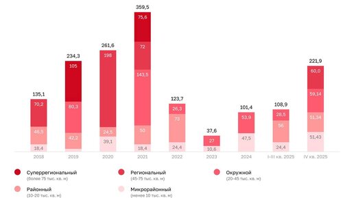 По данным NF Group, рынок торговой недвижимости Москвы демонстрирует активный рост. Основные показатели: Планируемый ввод торговых центров в 2025 году — 330 тыс. кв. м, что превышает суммарный показатель за последние три года С начала 2025 года уже введено 109 тыс. кв. м в 10 торговых центрах Показатель 2024 года — 101,4 тыс. кв. м До конца года ожидается открытие 15 новых объектов общей площадью около 200 тыс. кв. м Уровень вакантности в ключевых ТЦ Москвы по итогам III квартала 2025 года — 5,2% Ключевые объекты, планируемые к открытию в 2025 году: Avenue Sever — 60 тыс...