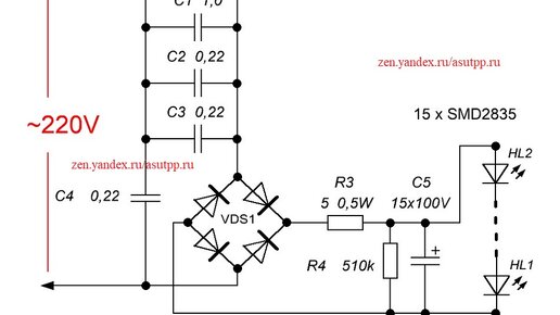 Схема, назначение деталей и описание работы драйвера светодиодной лампы