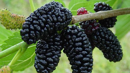 Шелковица Галиция с огромной ягодой. Очень крупные, вытянутые плоды, внешне похожие на ежевику. Но вкус у них свой – сладкий, освежающий, с ягодным ароматом. Длина ягоды может достигать 8 см, а ширина 2,5 см! Темно-фиолетовые или черные блестящие плоды сразу вызывают желание сорвать их и съесть. Сорт высокоурожайный, уже через 5-7 лет после посадки собирают до 40 кг с одного дерева...
