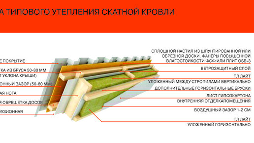 Схема утепления крыши 1. Кровельный материал. 2. Обрешетка кровли. 3. Гидроизоляционный материал. 4. Стропила с утеплителем. 5. Пароизоляционный барьер. 6. Обрешетка. 7. Внутренняя отделка помещения. При...