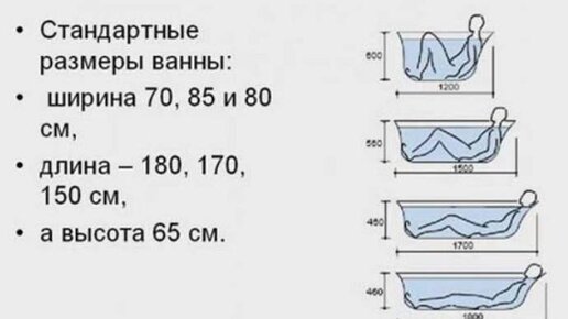 Ванна стандартной формы считается прямоугольной, круглая и угловая, а также изготовленная на заказ из естественного или искусственного камня считается не стандартной. Высота у них примерно одинаковая – 60-65 см, наливаются они обычно до уровня 40-45 см, и уже в зависимости от объёма тела принимающего ванну человека вода, вытесненная им, может подняться до отметки 55-60 см. На этот же уровень, кстати, рассчитано и отверстие перелива. Таким образом исключается риск выплёскивания воды на пол. Длина стандартной прямоугольной ванны из чугуна, акрила или стали 150, 170 и 180 см...