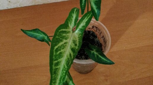 Это мой один из сингониумов, который был без названия. Но потом все-таки оно отыскалось. Купила на одном из рынков Луганска совершенно случайно (понравился очень). Сингониум уже успел вырастить один листик за месяц, который у меня находится. В уходе совершенно неприхотлив. Пока не пересаживала его из стакана в котором покупала. Пусть еще немножко в нем посидит. Я так думаю, что его все ровно туда недавно тоже посадили. Стоит у меня сингошка на восточном подоконнике...