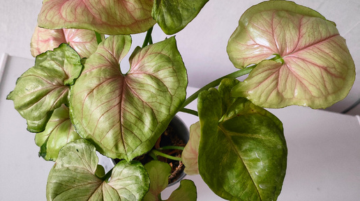 Сингониум MANGO ALLUSION (манго аллюжн) - коренастый, крупнолистный сорт с толстым стеблем. Из-за коротких междоузлий считается кустовым сортом. Листья округлые с яркими розовыми прожилками, с возрастом зеленеют, прожилки становятся менее заметными, и уже не так привлекают к себе внимание. Данный сорт сингониума ко мне попал абсолютно случайно...