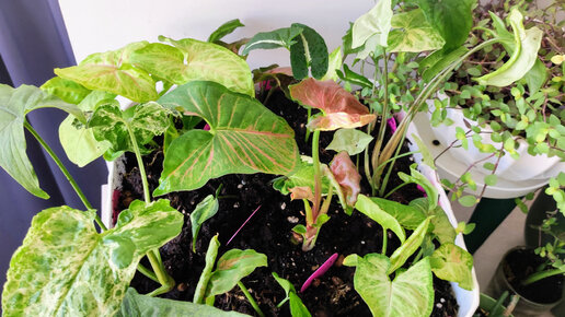 На выходны пересаживала растения в связи с приобретением новеньких. Сломала голову, что делать с сингониумами. У меня их больше 10 сортов, большинство малыши, но есть и те, кто расзросся. Решила разделить крупные, а остатки посадить вместе в грядку пока. Выращивать их по отдельности нет сил. А если спроса не будет, продам еще какие-нибудь свои растения, чтобы освободить мест под горшки. Большие кусты сингониумов смотрятся хорошо Рассадила деленки по стаканам и выставила сегодня на авито. Лимитов...