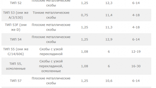 Универсальные скобы, производятся сейчас в широком диапазоне размеров, причем важна не только высота скобы, но и ее длина, а также толщина. Скобы делятся на несколько типов в зависимости от совокупности данных параметров. Размеры скоб разных типов приведены в таблице ниже.