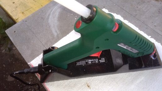 Оказывается термоклей очень полезная штука в быту, будь то частный дом или городская квартира. Встала маленькая проблема - экстренно приклеить пенопласт к шиферу. И тут пригодился пистолет для термоклея, приобретенный по совету друга на будущее, для поделок и творчества. Первый опыт показал , что вещь в быту нужная и во многих случаях универсальная. Пистолет на подставке, 480 руб с кейсом, хранить удобно и такой вариант предпочтительнее - не затеряется среди инструментов. Клей работает просто...