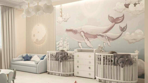Просторная спальня с волшебным оформлением стен и оригинальной детской мебелью. Готовый проект для комнаты в светлых тонах с дизайнерской мебелью для новорожденных. Подробнее смотрите здесь Уютной и нежной получилась спальная зона. Мебель для двойни дизайнеры выбрали в белоснежных тонах. Кроватки с высокими защитными бортиками разделяет комод с пеленальным столиком. Прямо на стене над кроватками среди пышной морской пены плавают огромные киты и маленькие кораблики – ребятам очень понравится разглядывать эти красочные картинки перед сном...
