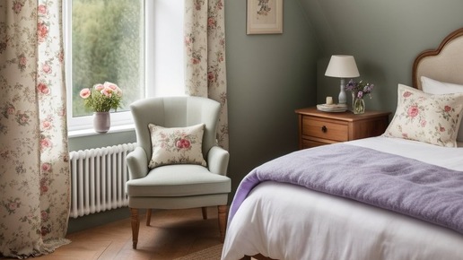 Интерьер спальни в стиле прованс цветочный принт и дерево