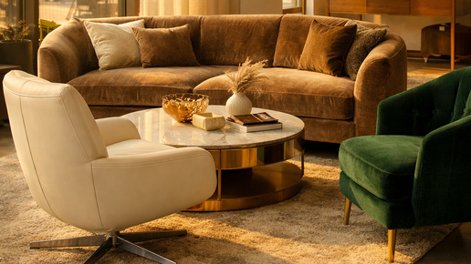 Открываю дверь шоу‑рума рано утром и, почти не заглянув в рабочий чат, ловлю краем глаза, как в широкое окно ложится мягкий золотистый свет. Он скользит по бархатной фактуре дивана, находит угол подушки, задерживается на молочно‑белом кожаном кресле, а потом сливается с изумрудным бархатом, как будто художник вырисовывает картину прямиком в вашем доме. Такое утро — роскошь. Особенно если квартиру отливают из серого бетона, а уют и цвет — это ваши решения, ваши смыслы. Цвет мебели в интерьере — это не просто вопрос о том, «какой диван сейчас модный?»...