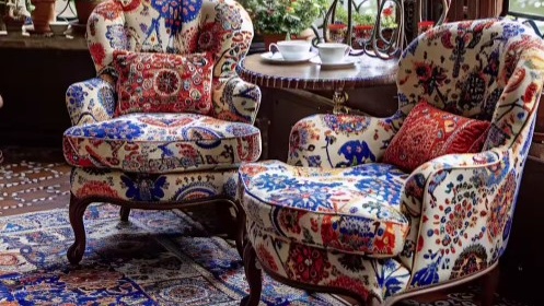 В одном небольшом городе на городской набережной стоит маленький, но очень весёлый домик. Его стены расписаны яркими разноцветными орнаментами, а на балконах расцветают цветы. Но самое удивительное можно увидеть внутри. В гостиной стоят кресла, обитые тканью с вышитыми цветами. Подушки на креслах яркие и пестрые, будто сшиты из лоскутков весны и лета. Ковёр на полу кажется настоящей клумбой, настолько живыми выглядят изображённые на нём цветы. В кухне всё выглядит не менее природным: стены и плита украшены цветочными орнаментами...
