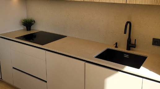 Столешница и стеновая панель из кварцевого камня Silestone Coral Clay в матовой поверхности Suede, толщиной 20 мм. Silestone — это высококачественный кварцевый камень производства компании Cosentino, который более чем на 90% состоит из натурального кварца. Сегодня хотели бы напомнить о преимуществах камня Silestone: 1. Долговечность. Silestone изготавливается на основе натурального жильного кварца, что обеспечивает ему высокую прочность и устойчивость к механическим повреждениям. Этот материал не боится царапин и ударов, что делает его идеальным для кухонь и ванных комнат...