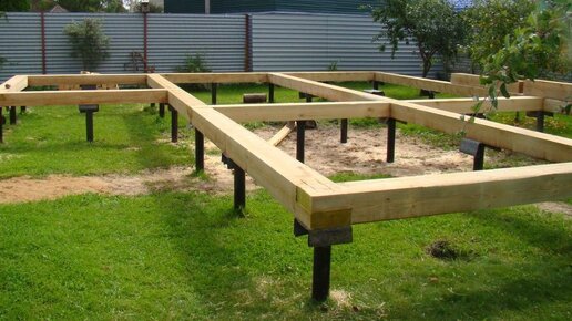Свайный фундамент - еще один популярный вариант. Однако обладающий двумя серьезными недостатками: Такая конструкция состоит из нескольких столбчатых элементов, которые устанавливают по углам и в местах сильной нагрузки, погруженных в грунт до необходимого уровня и связанных между собой на поверхности ростверком - горизонтальным каркасом. Благодаря ростверку вся конструкция становится единой, он также обеспечивает распределение нагрузки по всей площади фундамента. Свайный фундамент показан на тех...
