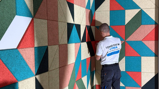 Монтаж акустических панелей-пано Саундек на стене.