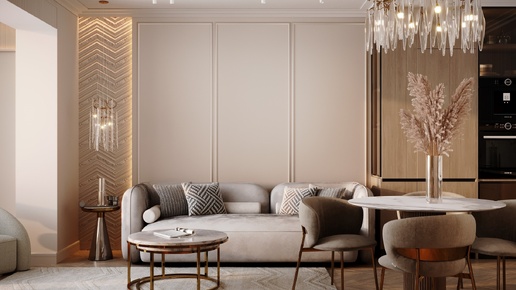 Это место, где утро не начинается, а продолжается — даже если за окном уже глубокий вечер. Кухня-гостиная здесь словно выткана из первого света, из молочного пара, из лепестков чайной розы и сухой травы. Это интерьер, который шепчет, а не говорит. Всё здесь подчинено одной мелодии — нежности. Стены выбелены так тонко, что кажутся чуть тронутым теплым мелом холстом, готовым хранить тени и блики. Пол под ногами — матовый, светлый, похожий на песок, остывший после заката. А главную партию в этом оркестре полутонов играет текстиль и свет...