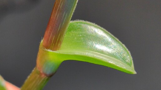 Ее длинные светло-зеленые плети с мелкими редкими листочками нависали надо мной каскадом. Сидеть под ней было прикольно, но восторга она не вызывала. Хозяйка дома же пела ей дифирамбы, она была прям в экстазе от быстрого роста и необыкновенных листиков. Пригляделась. Да, листья были необыкновенными. У обычных традесканций они плоские, как все листья в природе. А тут сложенный лодочкой, напитанный соком, он был весьма пухлым и напоминал подушку. Снизу лист был плотным, а сверху сквозь прозрачную рифленую пленку видны все внутренности...