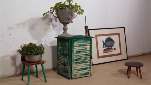 Необычный, но функциональный предмет интерьера из старых ставен. Отпилить бруски по размеру ставней с небольшим запасом. Закрепить бруски к 2-м ставням с двух сторон уголками с помощью саморезов. Ставни с брусками соединить меджу собой третьей ставней (без брусков). Крышку и дно тумбочки выпилить из фанеры под размер П-образной заготовки. Крышка должна больше на 4 см. с каждой стороны. Прикруить детали к тумбочке саморезами. К ставне, которая будет служить дверкой тумбочки, саморезами прикрутить рояльные петли...