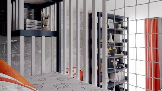 Акцентный интерьер комнаты в современном стиле. Стильная мебель в детскую трехлетнего мальчика – будущего автогонщика от фабрики Mamka. Подробнее смотрите здесь Все ребята любят машинки, поэтому декор и мебель в детскую трехлетнего мальчика подбирались в цвете асфальта. Ярким акцентом стали детали красного тона. Именно такой оттенок имеет любимый мальчишками персонаж мультфильма «Тачки», гоночный болид Молния МакКуин. Для его изображения нашлось место на стене в спальной зоне. Удобная двухъярусная кровать у изголовья дополнена широкими ступенями на второй этаж...