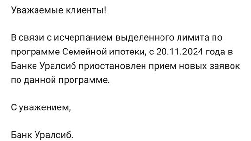 Решение принято в связи с исчерпанием выделенного кредитной организации лимита по этой программе. В начале ноября ДOМ.PФ распределил между банками дополнительные лимиты по семейной ипотеке в размере 350 млрд рублей. На долю банка «Уралсиб» пришлось 4,2 млрд рублей в то время, как, например, Сбер и ВТБ получили по 122,4 млрд. Последний раз «Уралсиб» выходил с таким же заявлением 22 октября этого года — то есть даже меньше месяца назад...