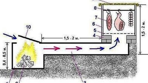 Построить коптильню холодного копчения из подручных материалов? И как коптить рыбу и мясо методом холодного копчения? Все очень легко и просто. 1 – топка; 2 – горящие дрова; 3 – дымоход; 4 – кирпичная кладка; 5 – решетка (металлическое сито); 6 – деревянный или металлический ящик (бочка) без дна; 7 – подвешенные мясные полуфабрикаты; 8 – металлические стержни с крючками; 9 – покрывало из мешковины; 10 – дверца топки. Температура дыма не должна превышать 250 С. Чтобы получить охлажденный дым, установка для холодного копчения должна быть разделена на две части...