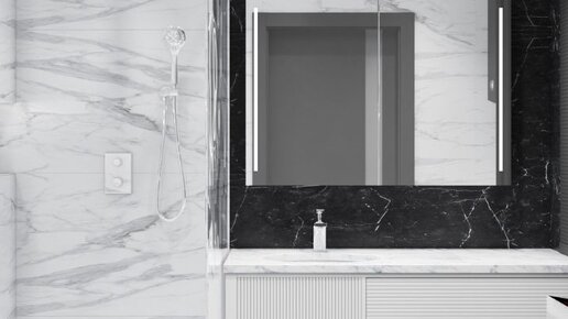 Мрамор – это универсальная фактура, уместная как в холлах, гостиных, так и в небольших ванных комнатах. Но важно создать пропорциональное пространство, в котором вам будет уютно и комфортно! Авторский проект – единственный доступный способ, который обеспечит вас всем необходимым в вашей ванной комнате, достойным дизайном и продуманной эргономикой. Ну а в качестве идеи, можете взять наш проект ванной в монохромном цветовом решении, из черного и белого керамогранита под мрамор. Ванная комната – это не только ванна, душ и унитаз с умывальником...