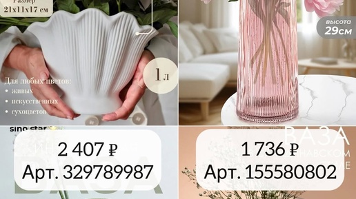 Подробный гид по фото — строго по порядку с артикулами и советами стилиста интерьеров Интерьер «звучит» громко, когда в нём есть правильные акценты: прозрачное стекло, выразительная керамика, неожиданные формы. Эти вазы — маленькие скульптуры, которые украсят дом и без цветов. Идём строго по порядку, как на фото: слева направо, сверху вниз в каждом коллаже. 1) Матовая ракушка, рельефная керамика, объём около 1 л — арт. 293882123 (1 867 ₽) Плавная волна и тонкий вертикальный рубчик создают ощущение морской раковины...