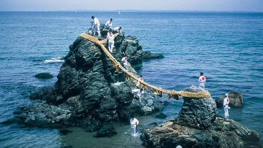 В Японии это называется «любовные камни» или «меото ива». Их довольно много в стране: можно наткнуться на две скалы в море или просто высоких камня, которые привязаны друг к другу веревкой или между ними перекинут толстый канат. Потому что если ты видишь любовь – ты ее соединяешь, вот как думают японцы. У этих скал несколько названий «скалы супружеской любви», «скалы жениха», «скалы жены и мужа», последнее и означает «меото ива». Японцы считают, что две скалы – одна побольше, вторая поменьше – выросли рядом не с проста...