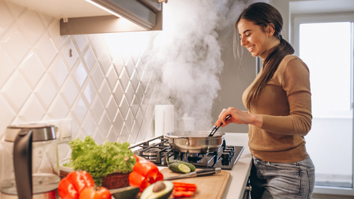 Во время готовки воздух на кухне часто становится влажным, душным, а окна начинают запотевать. В основном это происходит из-за пара, который поднимается от кастрюль и сковородок — особенно если вы готовите что-то долго, на большом огне и без крышки. Кстати, есть и менее очевидный источник влаги — сама работа газовой плиты. При сгорании метана (из которого в основном состоит природный газ) в воздух выделяется не только углекислый газ, но и водяной пар. Из одной молекулы метана и двух молекул кислорода получается одна молекула углекислого газа и две молекулы воды...