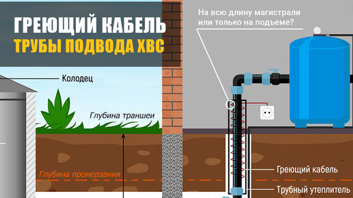 Конечно, часто этот вопрос зависит от конкретной ситуации. Но если труба проложена по правилам, ниже глубины промерзания почвы, то греющий кабель вдоль всей дины трубы не нужен, он нужен только в месте вертикального подъема трубы.