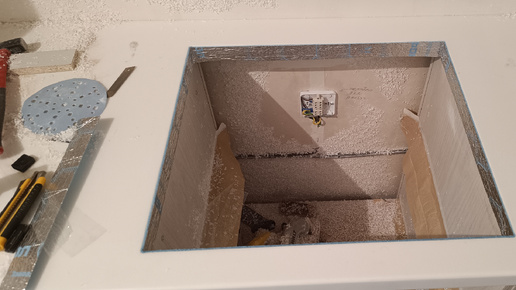 Шаг 1. В секции снизу нужно заклеить все механизмы, чтобы защитить их от попадания пыли и стружки. 2. Разметьте место для выреза и просверлите отверстия по углам будущего выреза. 3. С помощью удобного инструмента (погружная пила, паркетка или лобзик) вырежьте отверстие по периметру, оставляя запас 2 мм от намеченной линии внутрь. 4. Установите направляющую и с помощью фрезера доведите вырез до точного размера. Это позволит убрать все зазубрины от полотна. 5. Фрезером расширьте углы выреза, чтобы предотвратить образование трещин из-за тепловых расширений...
