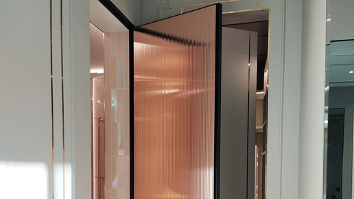 Эта дверь установлена в квартире в ЖК «5 звёзд» и ведёт в санузел. Со стороны ванной мы выполнили её из декоративного зеркала с тёплым розовым оттенком, фактура сделана при помощи сплошной алмазной гравировки, что дает изделию современный акцент. Его мягкое отражение создает иллюзию простора, красиво рассеивает свет и добавляет игривости в строгий интерьер. Ручки чешского бренда M&T, модель Konzerva, окрашены в тон стекла, что делает композицию цельной и выразительной. В конструкции использован магнитный замок, обеспечивающий плавное и бесшумное закрывание, а также сантехническая защёлка...